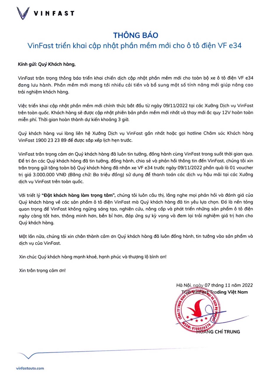 Ngày 07/11, VinFast thông báo triển khai chiến dịch cập nhật phần mềm mới cho toàn bộ xe ô tô điện VF e34 đang lưu hành. Chiến dịch này sẽ được triển khai từ ngày 9/11 tại các xưởng dịch vụ VinFast trên toàn quốc. Thời gian xử lý dự kiến trong 3 giờ, bao gồm cập nhật phần mềm cho xe VF e34 lên phiên bản mới nhất và thay mới ắc-quy 12V miễn phí.